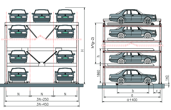 This type of equipment is designed in multiple layers and multiple columns, with one empty parking space on each floor except for the top floor. All parking spaces except the bottom floor can be raised and lowered, and all parking spaces except the top floor can be moved horizontally. When a parking space needs to access a vehicle, all the below parking pallet from the parking space to the empty parking space are horizontal movement by a distance of one parking space in the direction of the empty parking space, and a lift channel is formed under the parking space. Then the parking space can be free to go rise or down, when it drops to the ground level, the vehicle can go in or go out.