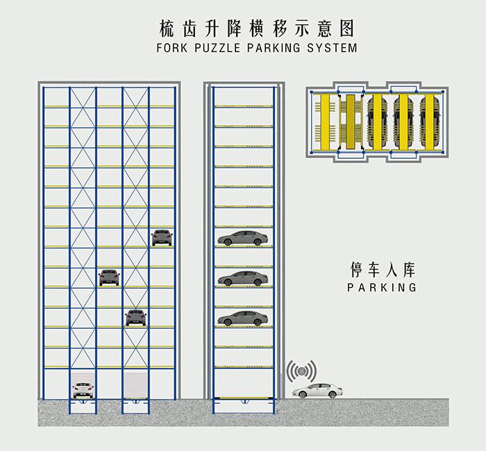 The equipment adopts the comb type carrier rack, which integrates the characteristics of Puzzle parking system and vertical lifting multi level parking system. The vehicle is stored on the horizontal comb rack. The horizontal comb rack supports the vehicle tire through the extended comb, and lifts the left and right comb racks, The vehicle is lifted from both sides of the transverse comb rack through tooth gap to complete the exchange. and the comb carrier rack has its own power device, The transverse exchange comb rack is arranged at the entrance, which can move any car to the entrance and exit.